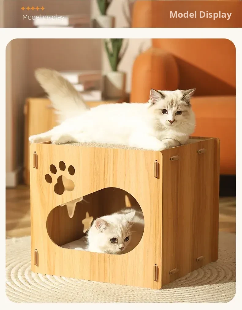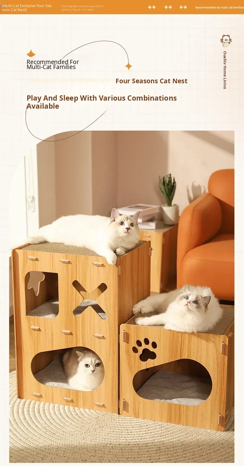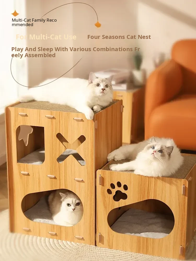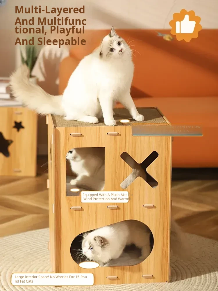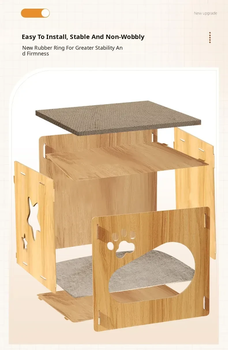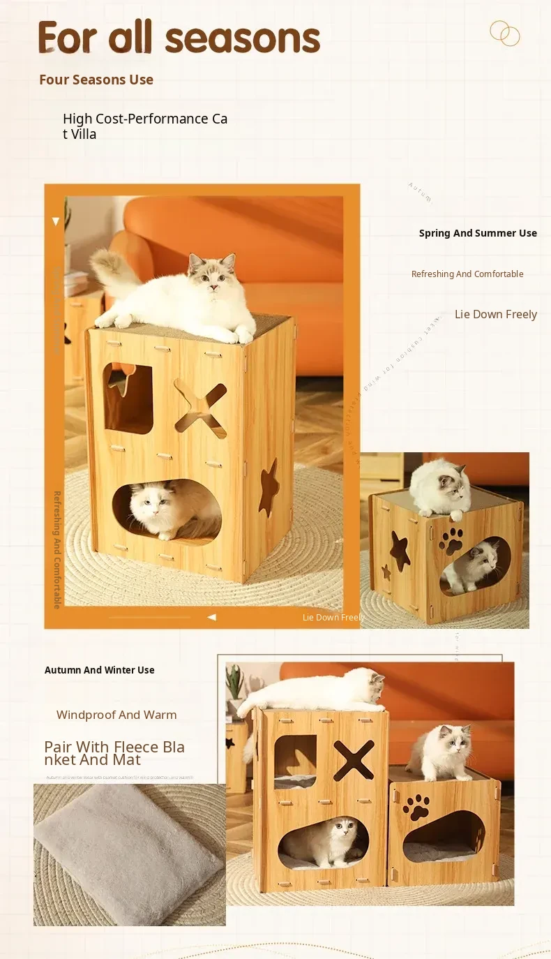 Cozy Multi-Season Pet Cube for Kittens - Cute Villa-Style Cat House with Scratch Pad, Play Area & Resting Space - Perfect for Fun and Relaxation!
