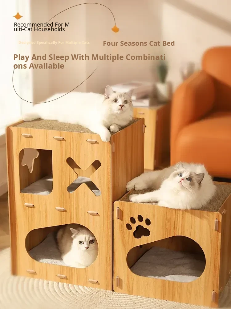 Cozy Multi-Season Pet Cube for Kittens - Cute Villa-Style Cat House with Scratch Pad, Play Area & Resting Space - Perfect for Fun and Relaxation!
