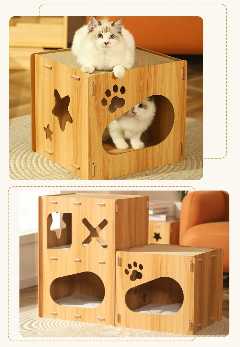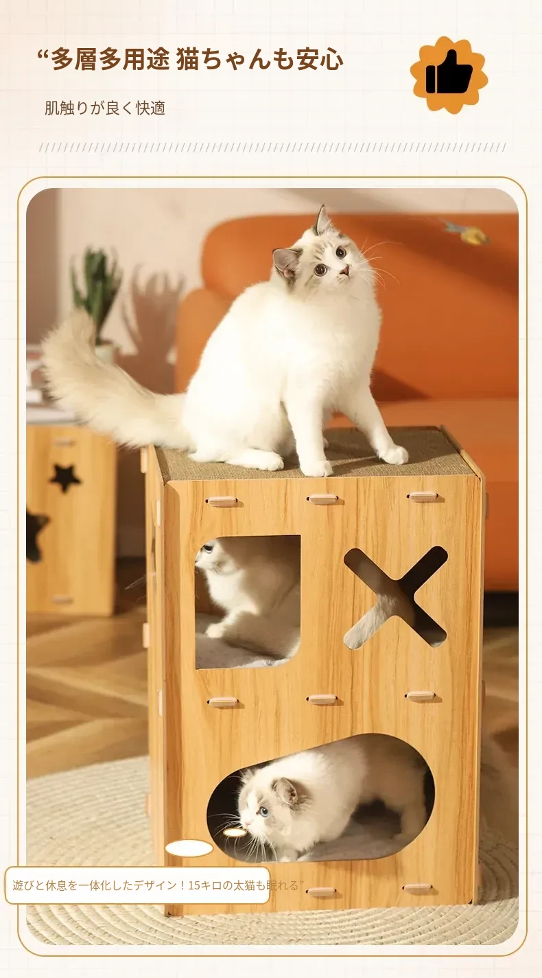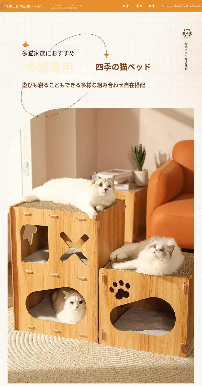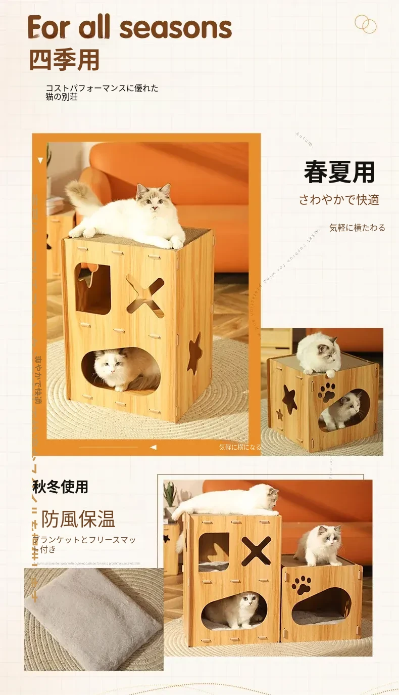 可愛らしいペット用マルチファンクションキューブ!四季にぴったりな子猫用ヴィラ型キャットハウス。爪とぎ、遊び、休息が一体化した理想的なアイテムで、愛猫も大満足!