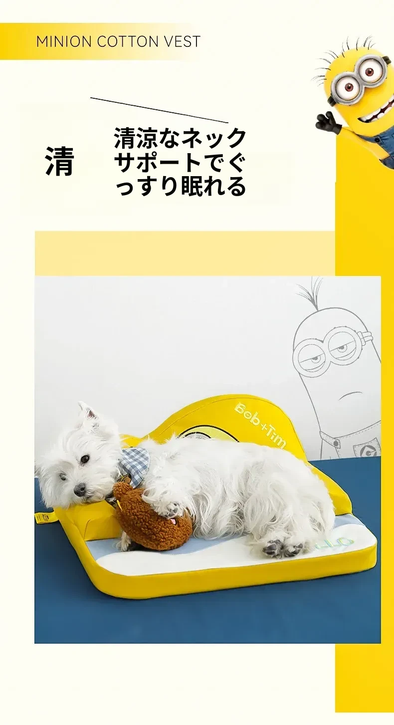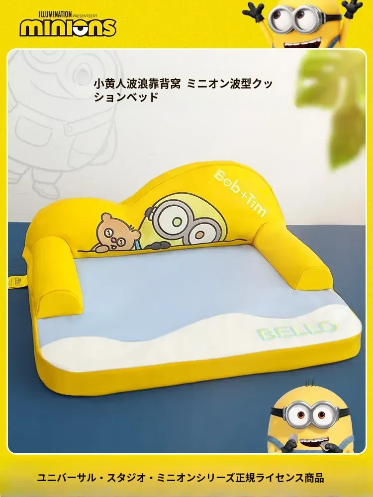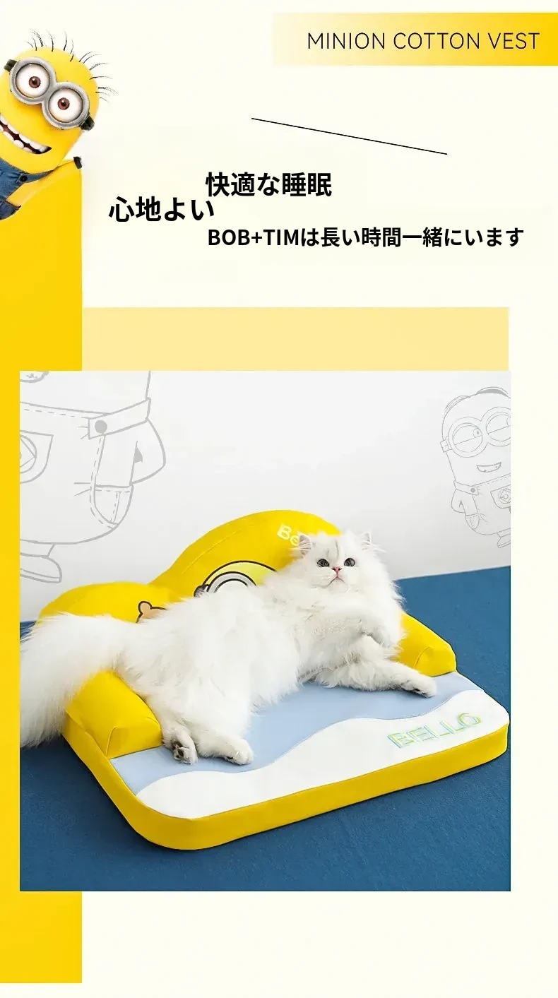 ペット用ミニオンズ波浪型背もたれベッド - 布団付きで快適なラグドール猫や小型犬に最適!洗えるデザインで清潔さをキープ。四季を通じて使える首サポートクッション付きで愛するペットにぴったり!