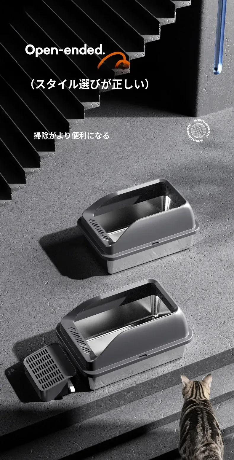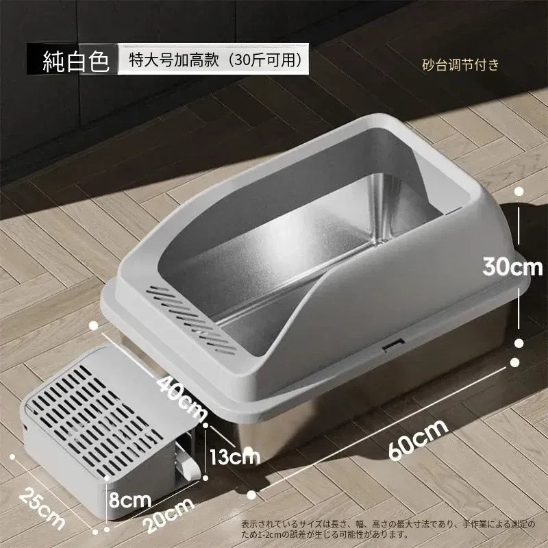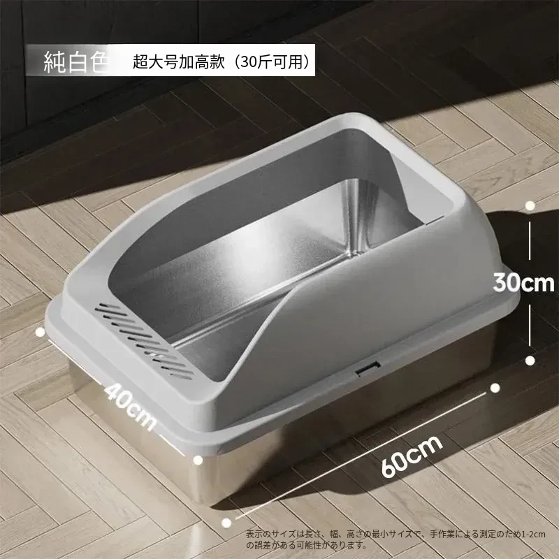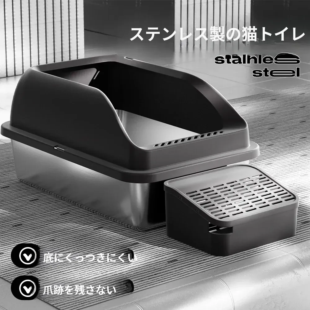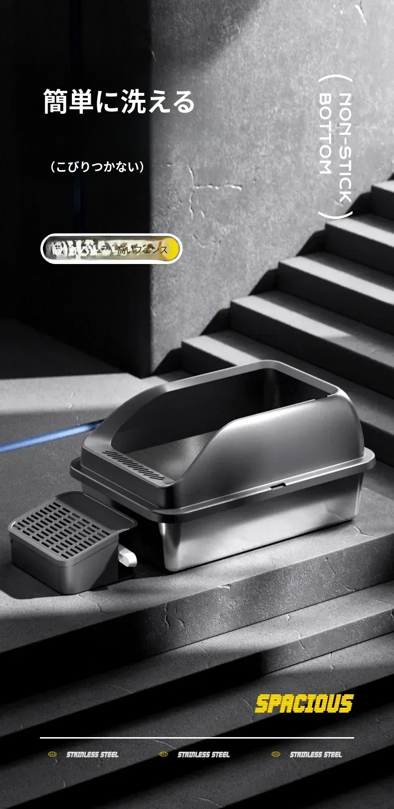 ステンレス製の超大型キャットトイレ!高い防飛散設計で安心、半密閉型のペット専用オープンキャットトレイ。愛猫の快適なトイレタイムを実現します!