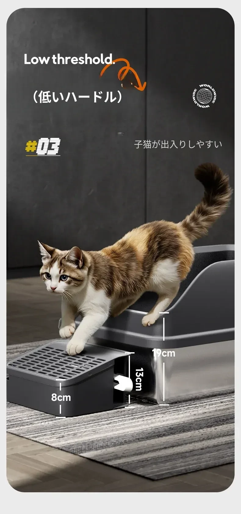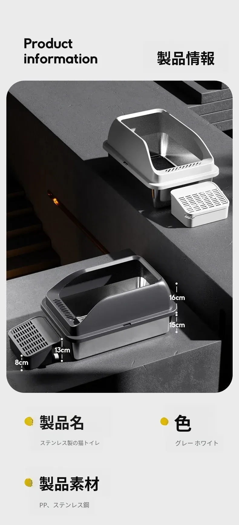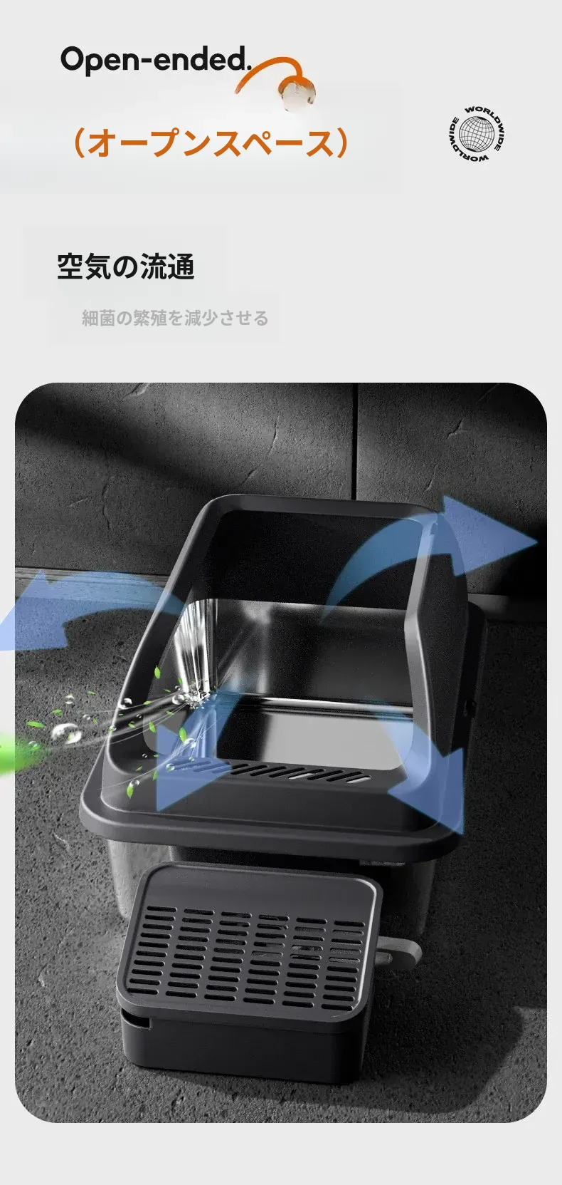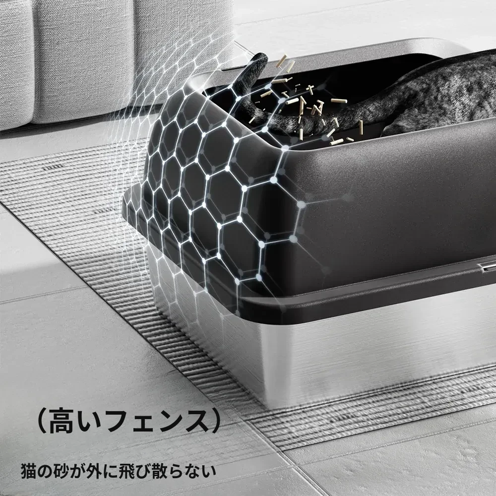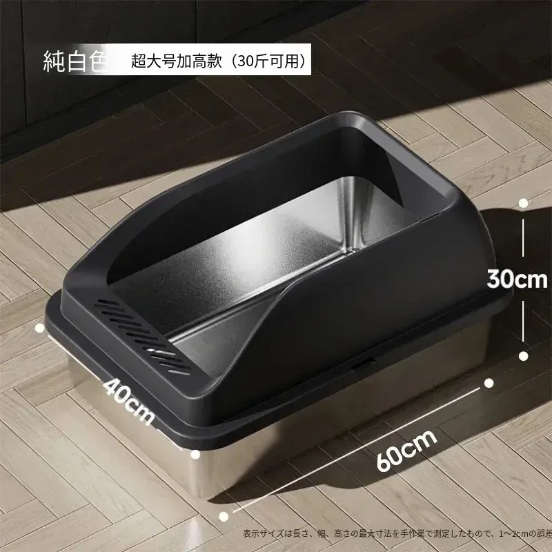 ステンレス製の超大型キャットトイレ!高い防飛散設計で安心、半密閉型のペット専用オープンキャットトレイ。愛猫の快適なトイレタイムを実現します!