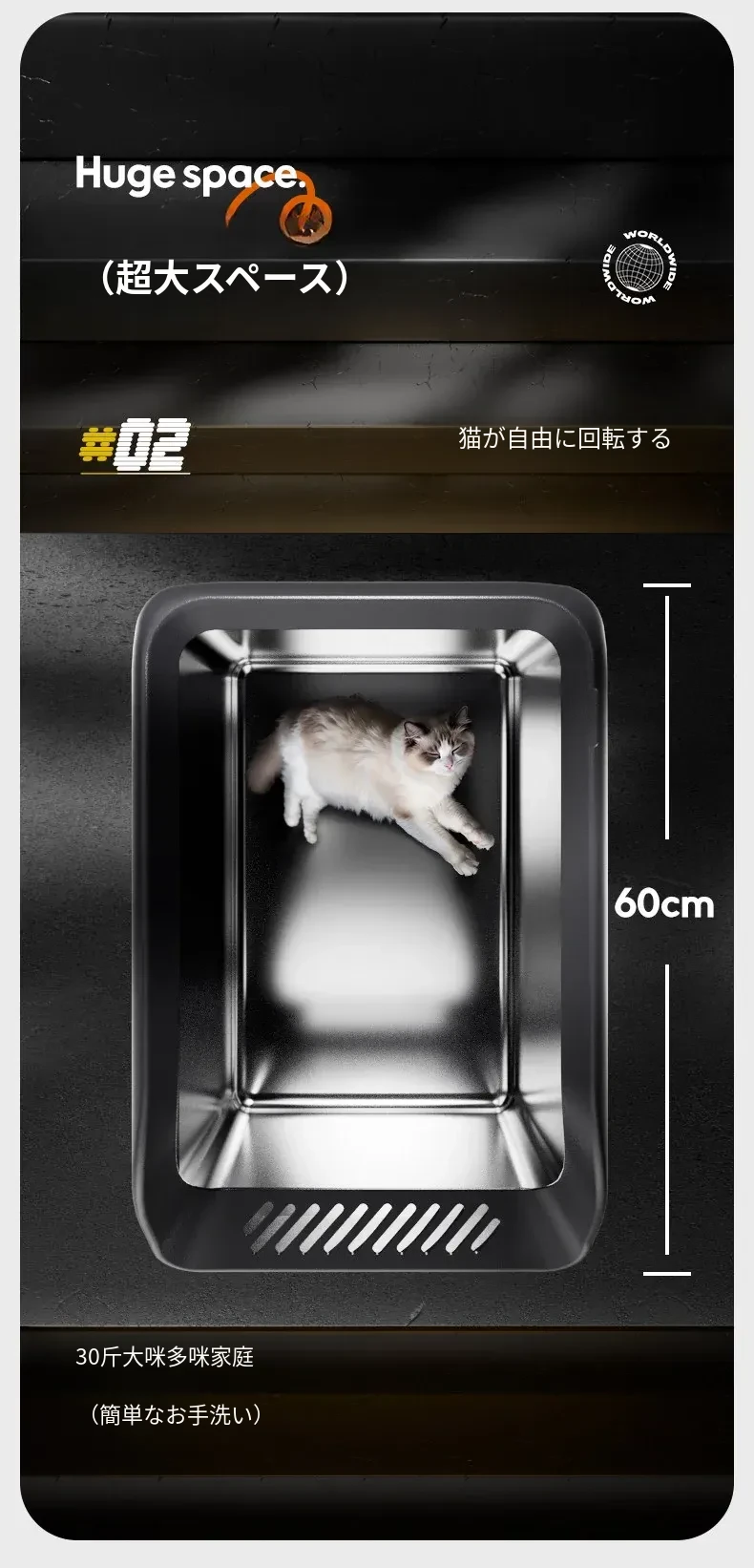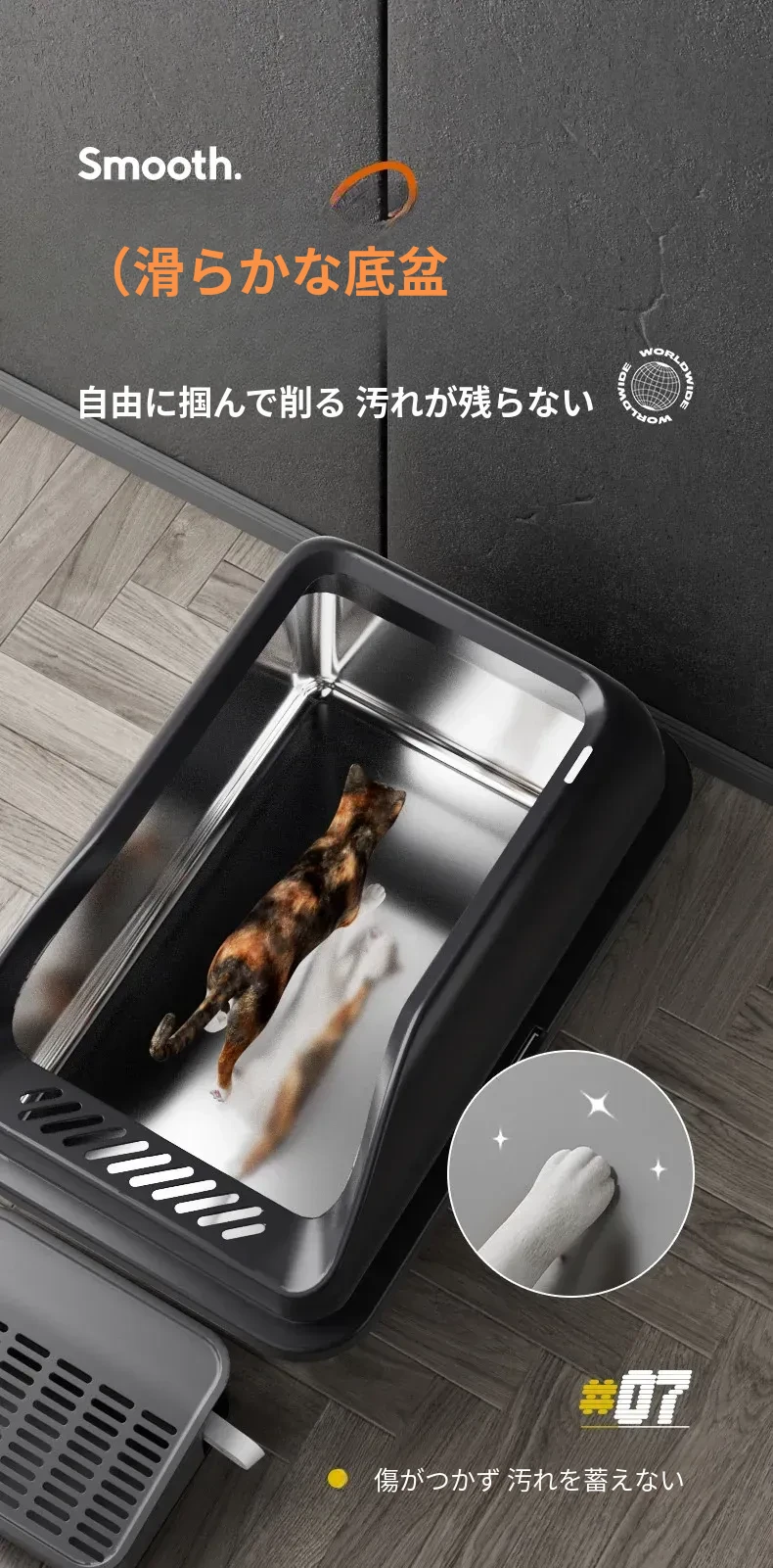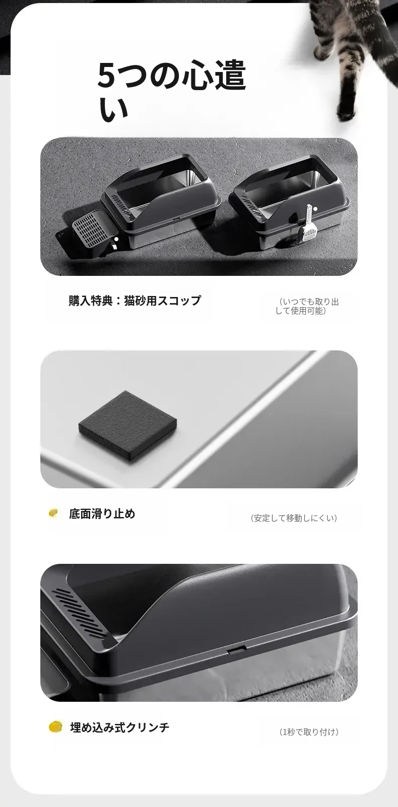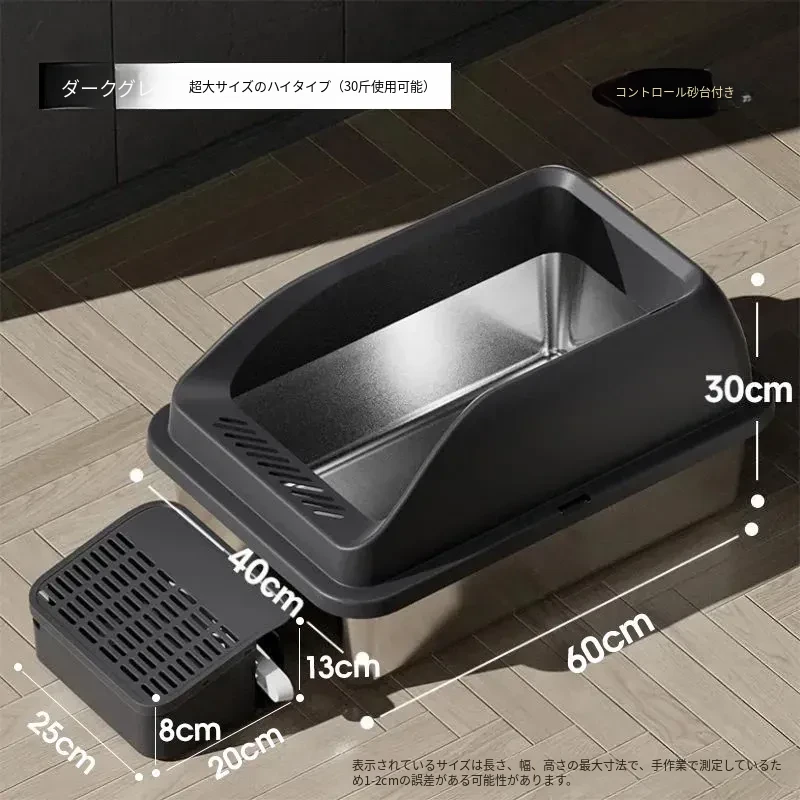 ステンレス製の超大型キャットトイレ!高い防飛散設計で安心、半密閉型のペット専用オープンキャットトレイ。愛猫の快適なトイレタイムを実現します!
