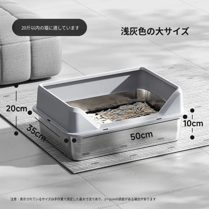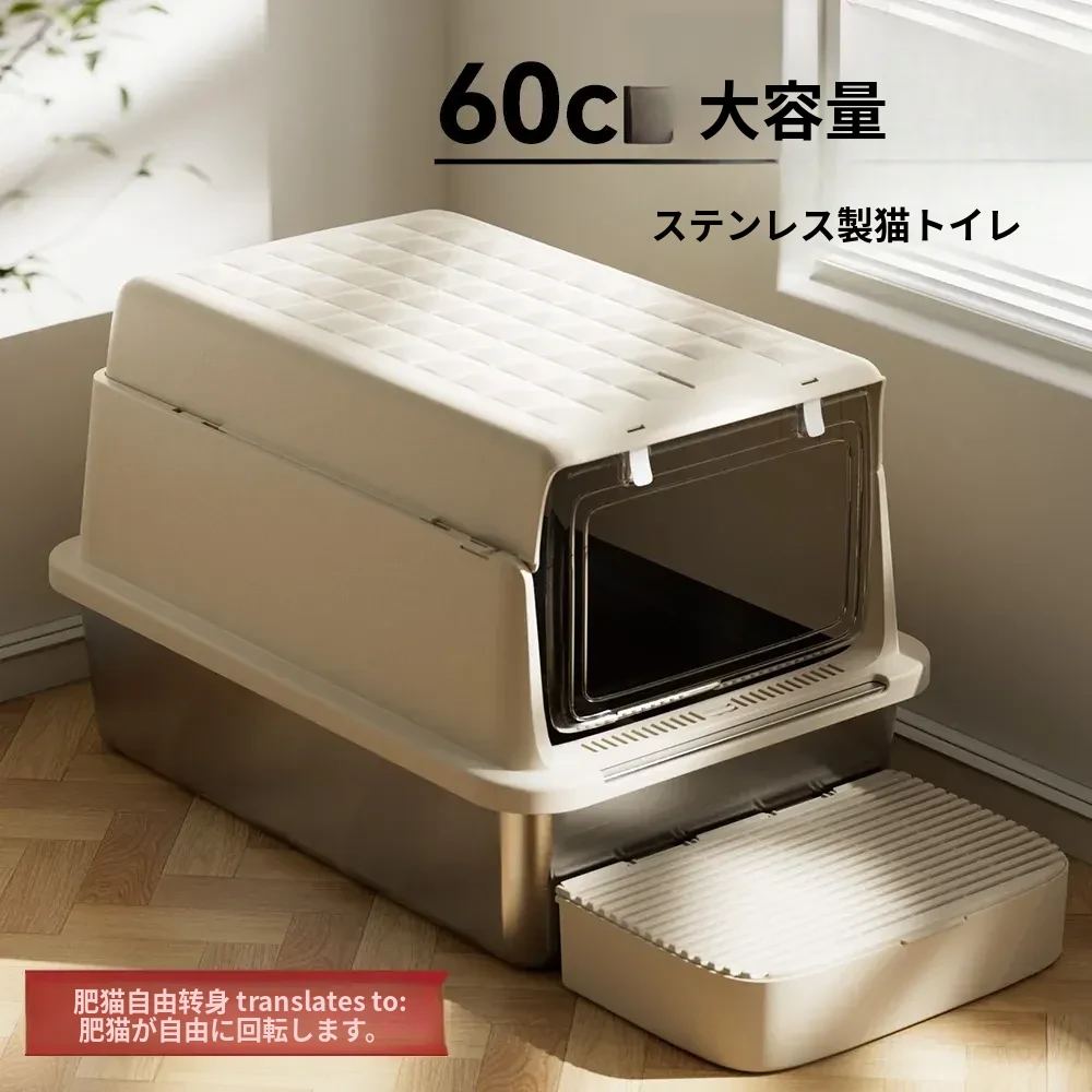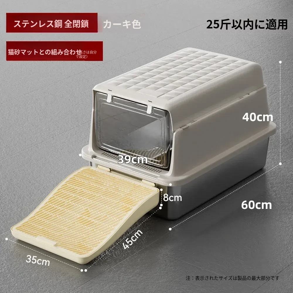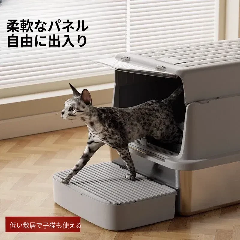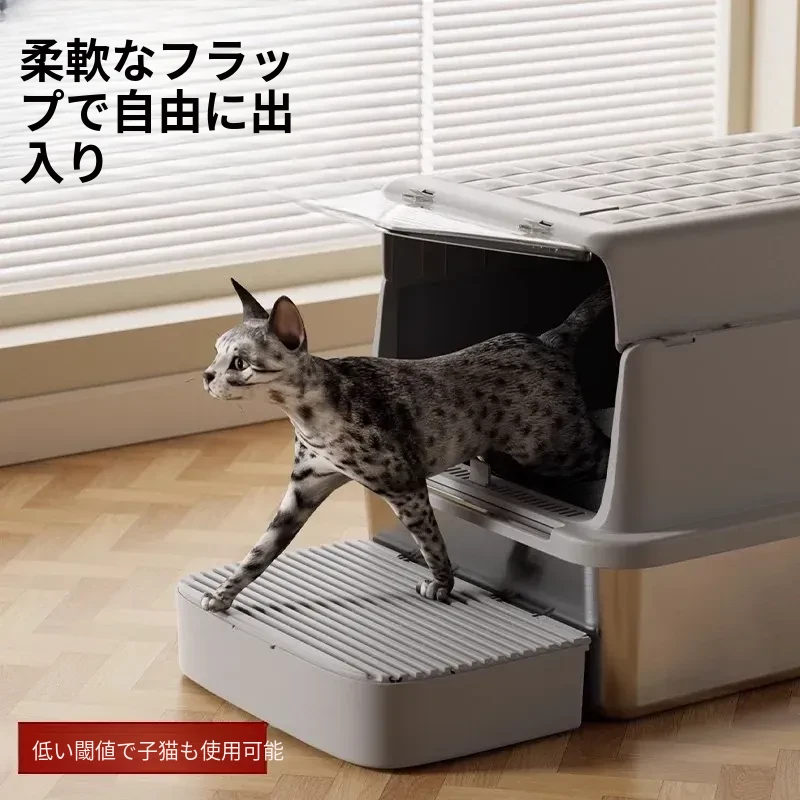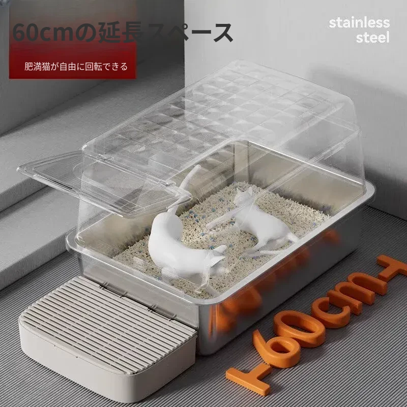 超大型ステンレス製キャットトイレ|防水・防砂・高くて広々としたデザインで、猫ちゃんも快適!砂が外に出にくい密閉型トイレ、踏み台付きでお手入れも簡単!あなたの愛猫に最適な選択です。