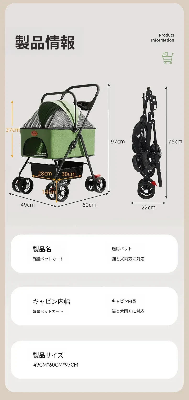 ペット用カート 小型犬・猫のための軽量折りたたみ式散歩カート 赤ちゃんにも使える便利なデザイン!お出かけがもっと楽しくなる!