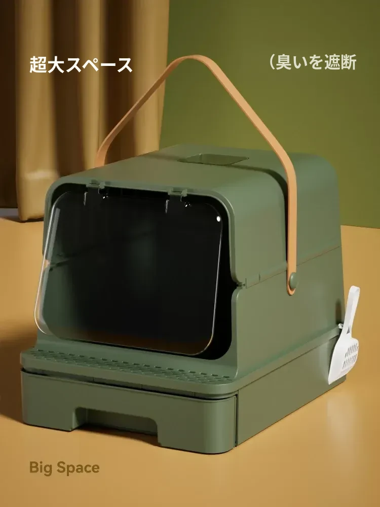 超大サイズの猫トイレ!飛び散り防止・全閉式・引き出し式デザインでお手入れ簡単!消臭機能付きで快適な環境を提供します。高さもあるので、愛猫が安心して使える猫砂盆です!