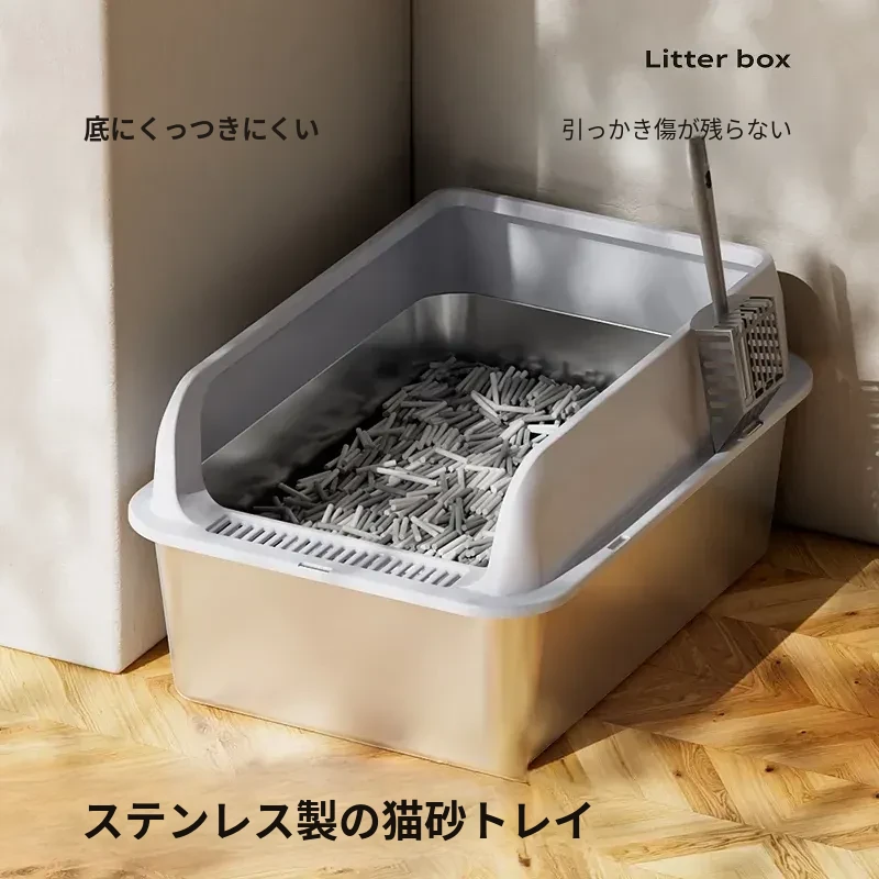 超大型ステンレス製猫トイレ - オープンデザインで飛び散り防止!特大サイズで高く、猫ちゃんが快適に使える猫砂盆。あなたの愛猫に最適な選択肢です!