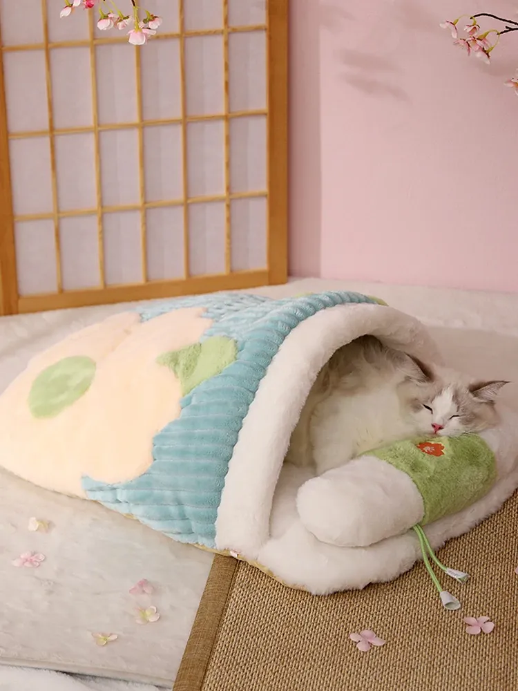 冬も暖かい!半封閉式デザインの猫ベッド - 子猫も安心、四季使える快適な寝袋とテント型ペットベッド!あなたの猫に最高の眠りを提供します。
