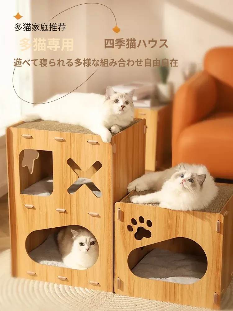 可愛らしいペット用マルチファンクションキューブ!四季にぴったりな子猫用ヴィラ型キャットハウス。爪とぎ、遊び、休息が一体化した理想的なアイテムで、愛猫も大満足!